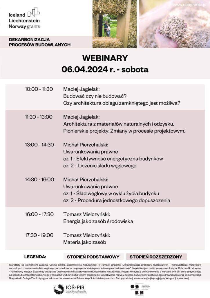 Projekt „Dekarbonizacja procesów budowlanych – wprowadzenie materiałów naturalnych o zerowym śladzie węglowym, w tym drewna, do gospodarki obiegu cyrkularnego w budownictwie”, realizowany przez Instytut Ochrony Środowiska – Państwowy Instytut Badawczy oraz Ogólnopolskie Stowarzyszenie Budownictwa Naturalnego, korzysta z dofinansowania o wartości 744 951 euro otrzymanego od Islandii, Liechtensteinu i Norwegii w ramach Funduszy EOG.